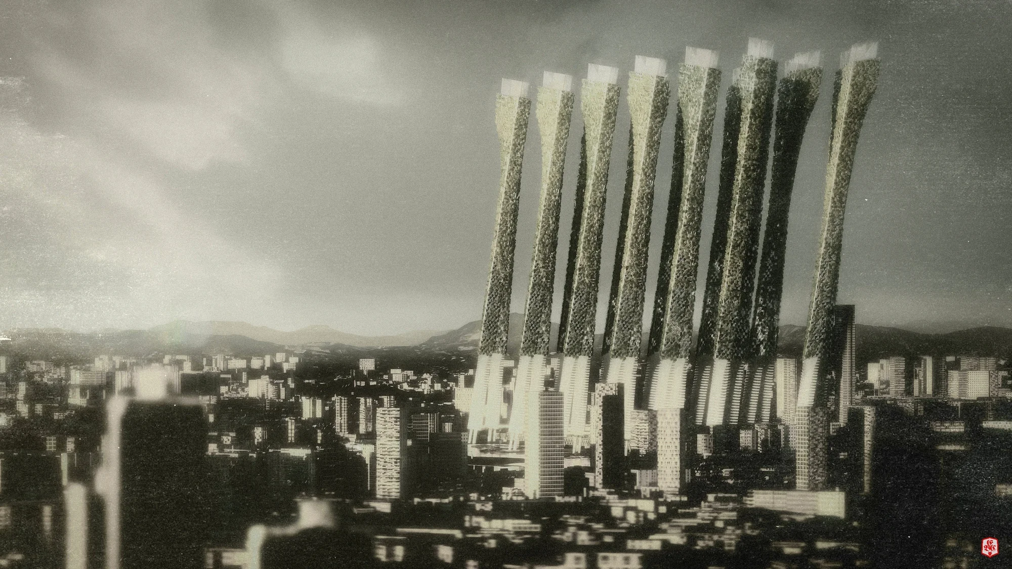 Twelve residential towers traverse the river, absorbing water and solar energy. Heliomorphic Seoul proposes sustainable energy models for thermodynamic performance, including solar orientation, absorption, and reflection. Façade panels use biomass to filter air pollutants and support habitats in the sky. Fog-harvesting screens capture precipitation high over the city. Heliomorphic Seoul produces novel forms of bioproductivity, radically reimagining the city’s growth traversing the Han.